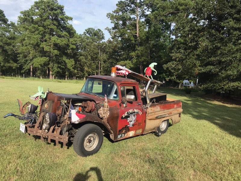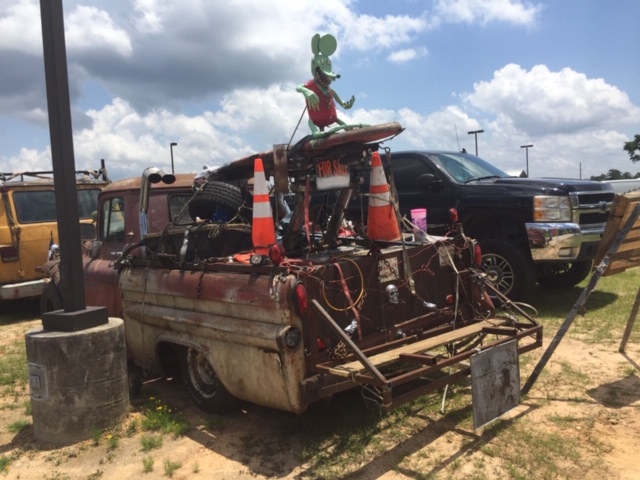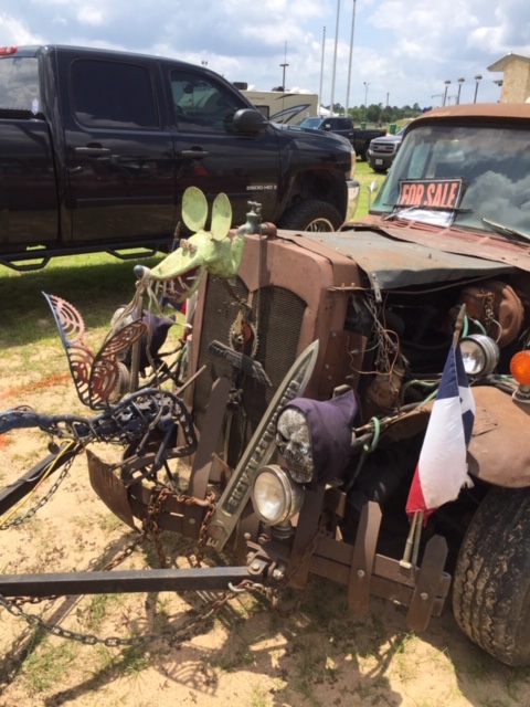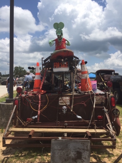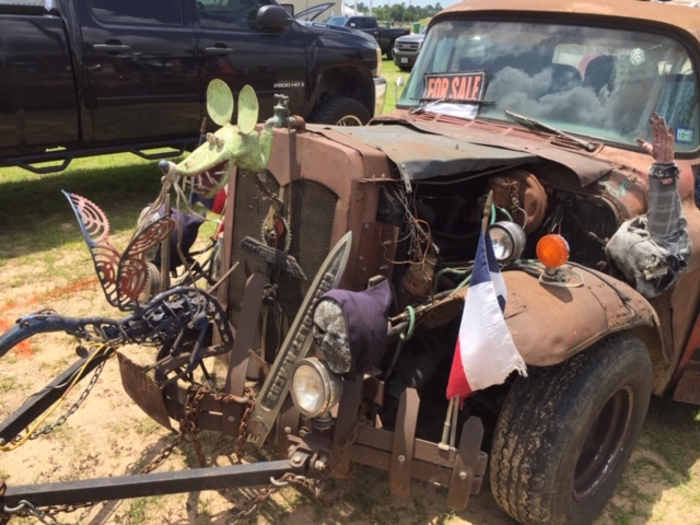 As we round one of the corners we see this “truck” and I am telling you it had “everything on it” but the kitchen sink. It was HILARIOUS. The guy that owned it had it hooked up to a old hippie van and he was selling out. It had an arm that waved at you, a whiskey bottle something in the engine, a surf board with a leg sticking out and the list goes on and on.