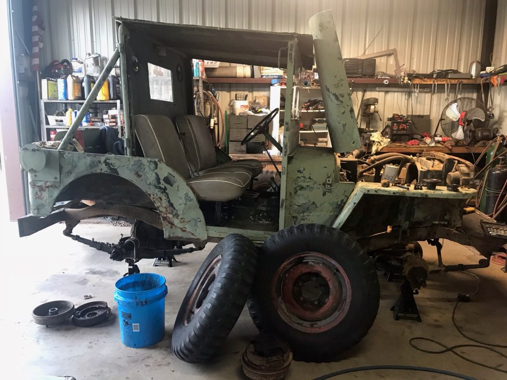 On a side note: He had bought a “bomb” from a antique dealer here in town a while back and it had been laying out by the shop for a while now. It also had seen its better days and thank goodness it had been detonated and was not “live”. But it was REAL. He had in his mind that this bomb was going to be part of this little jeep and I was concerned in more ways than one, but I have learned to just “roll with it“.