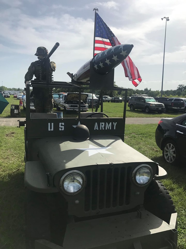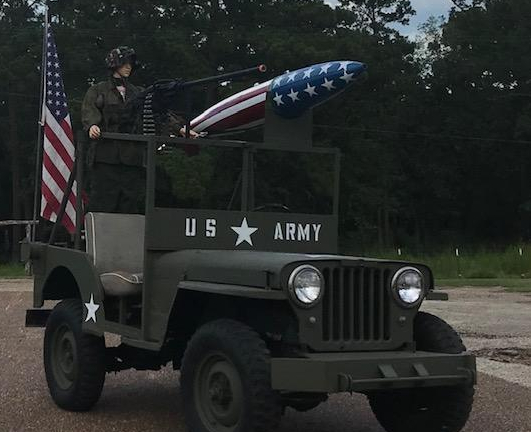 Now the last step was the mannequin slash soldier. We had this mannequin from someplace, she was a pretty little girly girl and we were going to attempt to make this our “soldier”. Have you ever attempted to make a girl mannequin into a tough soldier, it isn’t an easy feat. We went to army surplus stores and shops. We bought all kinds of goodies and dressed this mannequin up. Is she perfect – heck no!!! I have to say that we were pretty funny and we did raise some eyebrows when they ask us what we were doing. I guess one of the funniest sights of this dressing adventure would have been us trying to get that prissy little mannequin’s dainty little feet into those combat boots. We twisted and we turned, we even used a screw gun and by jiggers she/he has boots on. We got her/he all dressed up and we have all the goodies on the jeep. Helmets, old gas cans, even a machine gun. Our Flag is flying high and we have a cute little Willy to take to our parades.
